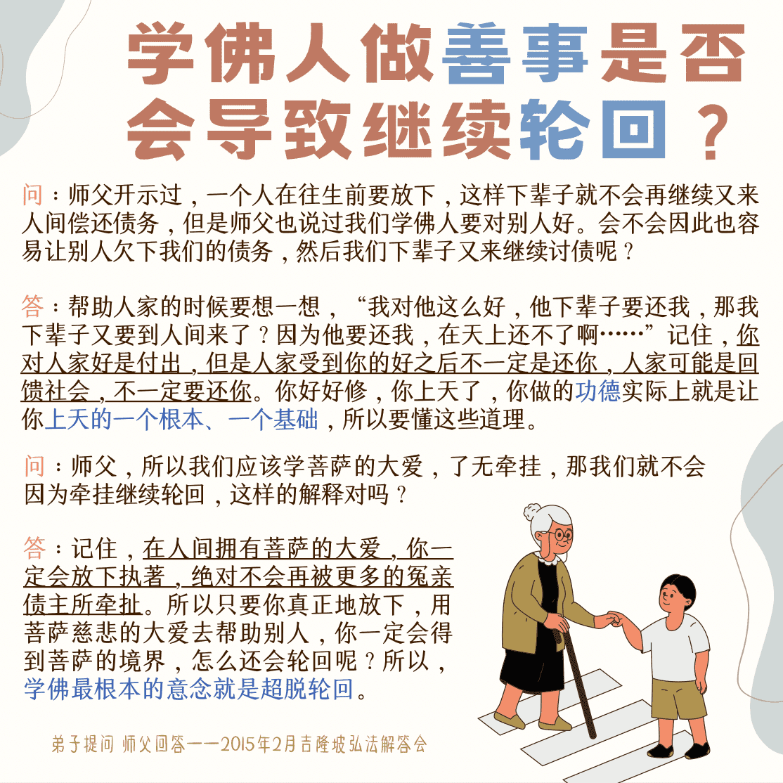 问:如果经济能力不允许,自己又在业力期,接受别人助缘去法会是否可以?如果接受了其他师兄的助缘,会不会耗自己的功德?“众生一粒米,大如须弥山”,如果功德不大的情况下,是不是最好不要接受助缘?卢台长答:好好做功德就可以。别人帮助你,别人在做功德,你接受功德要好好修,就不会有业背,就对得起别人,就不会欠他的业;如果不好好修,就会欠他的业。