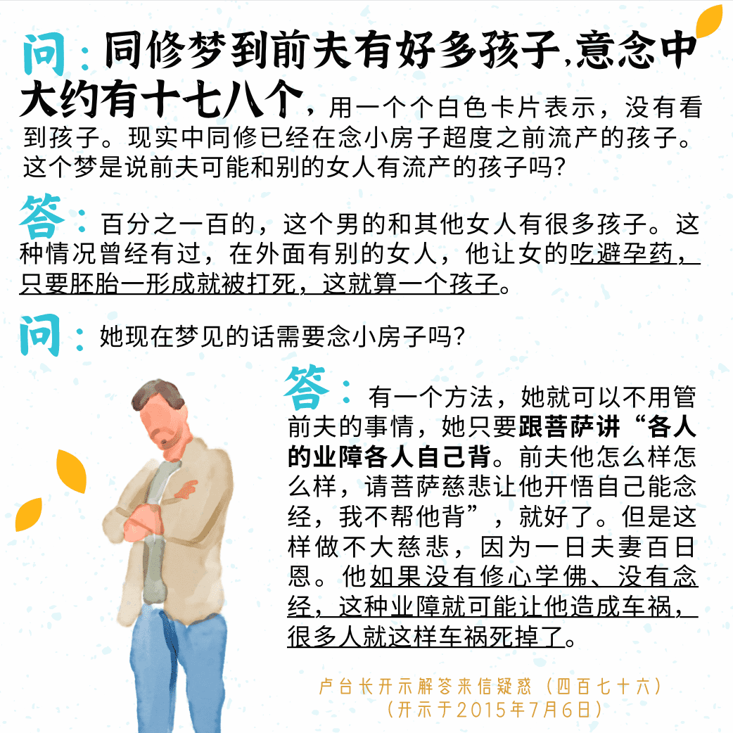 问:A同修帮B同修有忧郁症的孩子在自己家里烧送小房子,A同修连续几晚做恶梦,并且梦中向A同修要280元钱。A同修为此许愿280张小房子。请问,如果因为救度众生而背业,这样许愿280张小房子对吗?卢台长答:他一定是帮他背业了。背业之后,我曾经教过你们的,帮别人背业,为别人学佛付出的话,完全可以跟观世音菩萨讲:“观世音菩萨,我今天为了救他,我现在背了这个业,我念280张小房子,请观世音菩萨验证,能够帮助他超度,也希望我能够精进修行,功德增长。”我告诉你,你救了这么一个,只要是正能量地帮助别人,你这个功德一下子增上去,而且还会添福添寿。你们帮人家,如果背业了:第一,要念小房子;第二,一定要跟观世音菩萨讲。你们不要不讲,有的时候完全靠讲的。就像我现在完全看得出你们想什么,但是你说我会去看吗?道理都是一样。菩萨能够理解我们,知道我们在想什么,但是菩萨会整天看我们在想什么吗?他要看他就看得见,他不看那他就不知道了。