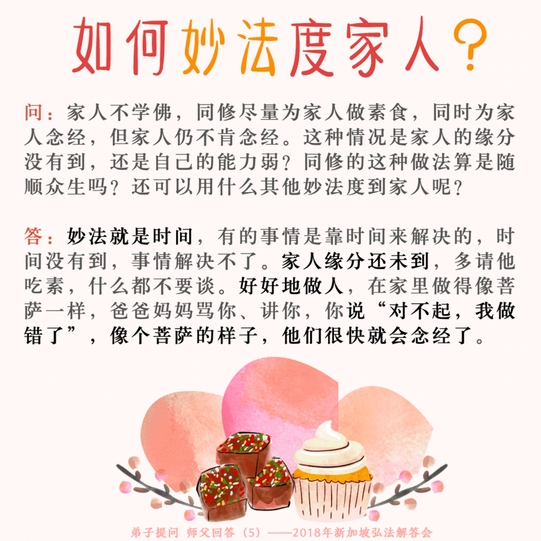 尊敬的同修您好!可能没沟通好,也可能冤结,也可能自己业障,或功德不够等。除了给对方念经化解冤结、开智慧,自己也要多消业还债,多做功德,而且学佛人以身作则才能令人信服。请参照师父的开示:【弟子提问】 201709-IT 被家人阻碍吃素怎么办问:有同修修学心灵法门,并积极出来弘法,她的孝顺女儿都很支持,但当该同修表示要吃全素时,女儿却极力反对,认为会缺乏营养。请问师父,这属于母女间的冤结,还是该同修的业障所为?该如何化解?卢台长答:不是冤结,那是缺少理解,好好念点解结咒就好了。说明女儿还是很爱妈妈的,跟她好好讲:“女儿,妈妈会有营养的,你放心好了。”全世界有多少人吃素?有上亿人在吃素,还包括很多西人,他们连皮包、皮鞋都不用的,他们都营养不良吗?到医院去查查看,死掉的全是吃素的吗?让他们多多了解就好了。【Wenda】 20120909B 20:24 家人不信佛与自身孽障的问题女听众:台长您看看我爱人,他不信佛嘛,我现在给他念了一年……台长答:好了,你想想看你修了一年,他都不信佛,说明你身上孽障还是重(是我身上孽障太重是吧?)对,你身上孽障不重,他怎么会不信佛啊?(我念什么经可以好点呀?是念消灾,还是礼佛?)不是这个问题,你要多念小房子给自己(不是念往生咒和礼佛?)对,念礼佛(我现在每天3遍礼佛)不够的,5遍。所以我告诉你家里的最亲的人还没有信,你一定身上有业障(那我就是每天要从3遍加到5遍礼佛是吗?)对(那我还要加念别的经吗?)别的不要加了,先好好念念礼佛吧,忏悔忏悔吧,多念小房子就可以了(我这一年也没少念,念了有将近一千多张小房子了)你要记住呀,你现在活到几岁啦?你不就是念了一年,你现在几岁啦?如果50岁的话,你只念了一年,这是五十分之一呀,你就想把50岁当中所有的孽障都全消掉吗?你说可能不了?还有你看你刚刚跟台长讲话你都发牢骚,我可以告诉你这种一点点的牢骚的话,菩萨都会觉得你这人根本没有……你现在根本不开悟呀,你不懂啊,“我念了一年怎么不好?”你怎么不说你50几岁啦?你还有上辈子带来的,一年就念得掉了吗?听得懂吗?(听得懂,而且原来我念经的时候,他造口业,现在倒不造口业了)那不是一天天在改吗?你以为这么容易念好的?不造口业已经很好了,还有的人还反对呢。你呀嘴巴少讲话啦,我告诉你,好好学佛啦,多念经,少讲话。台长跟你说你现在肚子里这种怨气还有这种想法都会阻扰你的功德的,所以念了一年你的功德都不大。你跟我讲两句话台长就帮你找出毛病了,还不知道自己毛病呀?好好改正啊,听得懂吗?(听得懂)这还像话(我争取明年上香港拜您为师。因为是造口业,我爱人他不信,所以我就不敢动作)好好努力,明白了吗?你记住你这么下去的话,水到渠成的,水没到呢现在(我一般初一十五去放生,我一放生回来他就炖鱼炖肉吃)还要跟你搞呢。好了,你多念心经吧!我告诉你呀,自己人不正己,焉能正人啊!你自己不正啊,你要叫他信佛,人家怎么可能啊!你说说看你讲了多少坏话,你在家里跟他两个人生活当中,你怎么样让他能够看得起你呀?你现在学佛了,你还教育他,你能教育吗?人家看见你这种样子学佛,人家都不愿意学了,听得懂吗?(听得懂)要教育人家的话,自己要正啊,自己要为人,要能够被他讲、被他骂不还口,人家再怎么样就说:“我做错了,我对不起”,你做得到吗?就你这种嘴巴,人家会跟着你学佛的啊?你不把人家慧命害掉都蛮好啦,好好改改自己毛病啊,你说说看你这个样子出去是像观世音菩萨不啦?好好改啊!真的(好,我一定改)这还像话。【解答来信疑惑(二百四十二)】 20180730 家人反对学佛吃素,梦见功德不够问:末学已经修学心灵法门两年多了,一直运用心灵法门的三大法宝来修心修行,解决很多生活中的困难。因为父亲本身业障深,还没有缘分接受心灵法门,也对我念经修行造了很多口业。我一直有吃素,但还不敢许愿,怕父亲知道后反感,造更多的口业。最近,在太太和同修的鼓励下,许愿吃全素的愿力越来越强。昨晚,太太参加白话佛法共修班回来,和我分享吃素的事情及转让吃素功德给爸爸。当晚我就梦见一个穿黑衣的男士跟我说“功德不够,要转70-80%”。卢台长答:自己家里有事情、毛病不好,全是因为功德不够。参加法会功德比较多,因为帮得到人。【Wenda】 20181109 27:29 度家人的最好方法是什么男听众:度家人最好、最快的方法,是不是自己的彻底改变?台长答:自己彻底改变是以身作则,让家里人看到你像菩萨一样,他就会学菩萨了,这是以身示表,这很好的(好,谢谢师父的慈悲开示)祝您学佛精进、福慧双修!东方台秘书处 合十