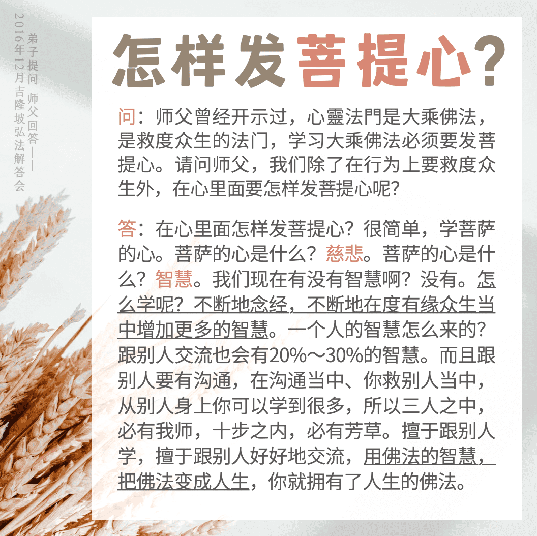 莲花掉了再上去,最重要的是知道问题并彻底改变 男听众:师父,如果莲花想种上去,您之前曾经开示过除了诚心念礼佛大忏悔文,还要送小房子消业,重新许愿,一般还需要做哪些事情才能让莲花重新栽上去?–答:就是要改,改是最重要的,要知道自己的毛病。如果你今天讲不出自己的毛病,你莲花下来,你不知道为什么下来,我告诉你,种不上去的(哦)你不肯承认自己的错误。有一个人莲花掉下来了,平时谁都看不出她有什么毛病,她就是鲜格格,只要看见共修会有男的来了她就鲜格格,莲花掉下来了。掉下来之后她知道,不承认自己这个毛病,一直种不上去。等到师父有一次告诉她,说她鲜格格了,后来她忏悔了之后莲花上去了。
