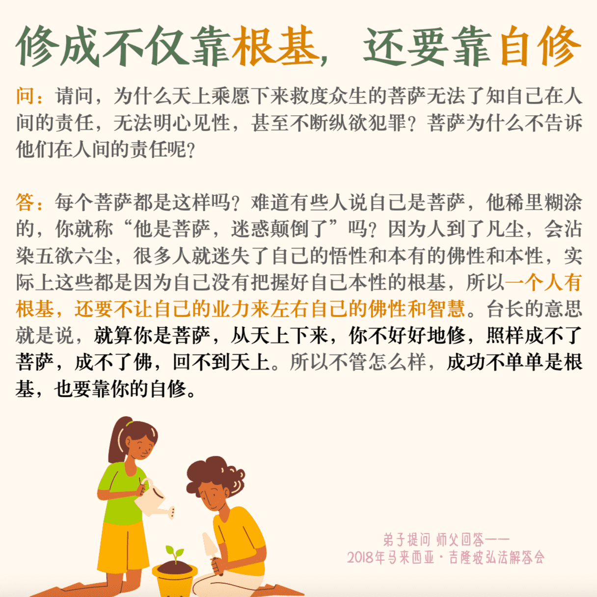 男听众:师父特别希望我们今生一定要修走,超脱六道。但是修走也是一件很难的事情,那我们平时在好好修的前提下,现在就每天给自己存一张自存小房子,和每天存几种自修经文,玩了命地念经,等到走的时候把它烧掉,是否可以保证我们能超脱六道、去极乐世界和四圣道呢?台长答:最重要的不是小房子,最重要的就是你的为人。“人成即佛成”这句话听不懂啊?你做人做得像佛了,你在人间已经跟菩萨一样地做人、做事了,人家都说你“哎哟,你这个人像活菩萨一样哦”,“哎呀,你怎么这么善良啊”,“你怎么这么好啊”……你说说看,这个人在人间是不是已经是菩萨了?(是啊,这就是师父讲的“人成即佛成”)嗯,就是这个道理啊。你这个人在人间已经做得像菩萨一样,那你以后肯定会到菩萨地方啊。对不对啊?(对对)