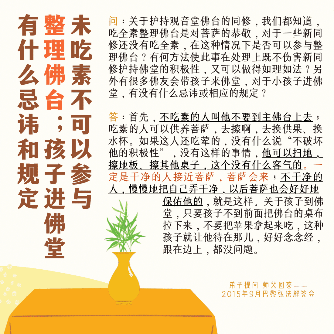 女听众:有位同修刚设佛台,他梦见晚上回家问他的母亲“你上香了吗?”母亲说无法上香,因为佛台很糟、很肮脏。他去看了佛台,佛台上的花瓶全部倒下破了。台长答:佛台真的肮脏了,就是手没弄干净什么的(他本身是还没有许愿吃全素)这肯定不行了(现实生活中,他早上上香,跟菩萨请示说他到底做了什么不如理不如法的事情,晚上又梦见我去他的家,我跟他说:“你准备了七道素食了吗?”就是要给同修们吃的,因为我带了同修又给他重新恭请菩萨)这个人脏,吃荤的人怎么弄佛台啊?(哦)