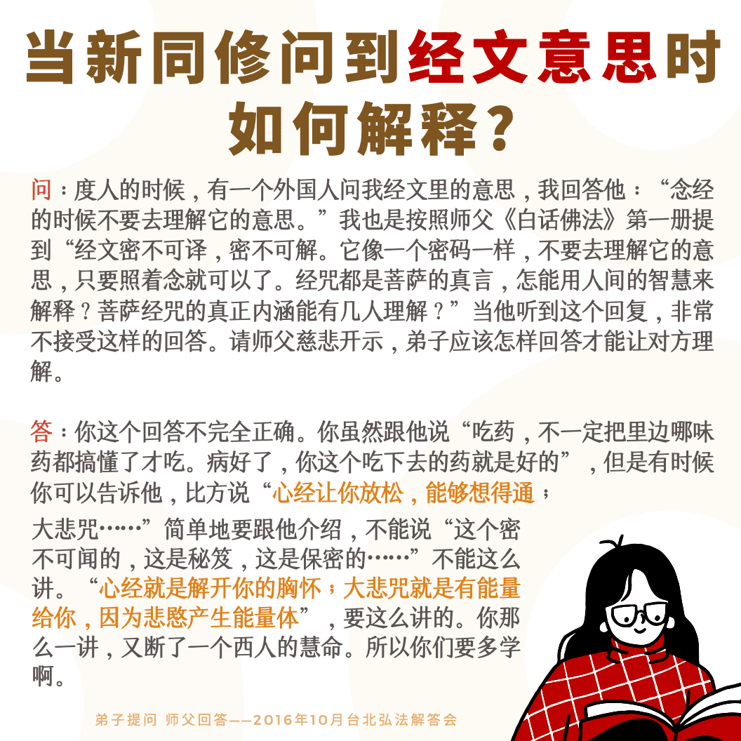 女听众:最后一个问题,礼佛大忏悔文里面一些文字我不是很理解,例如“最胜衣服最胜香,末香烧香与灯烛”是什么意思?台长答:每种经文一定要懂意思才念吗?所有的经文就像很多药一样,里边有很多种成份,医生给你吃什么药,你是不是要把成份都搞懂了再吃啊?(我明白这个意思了)自己好好努力吧(好的,谢谢台长)