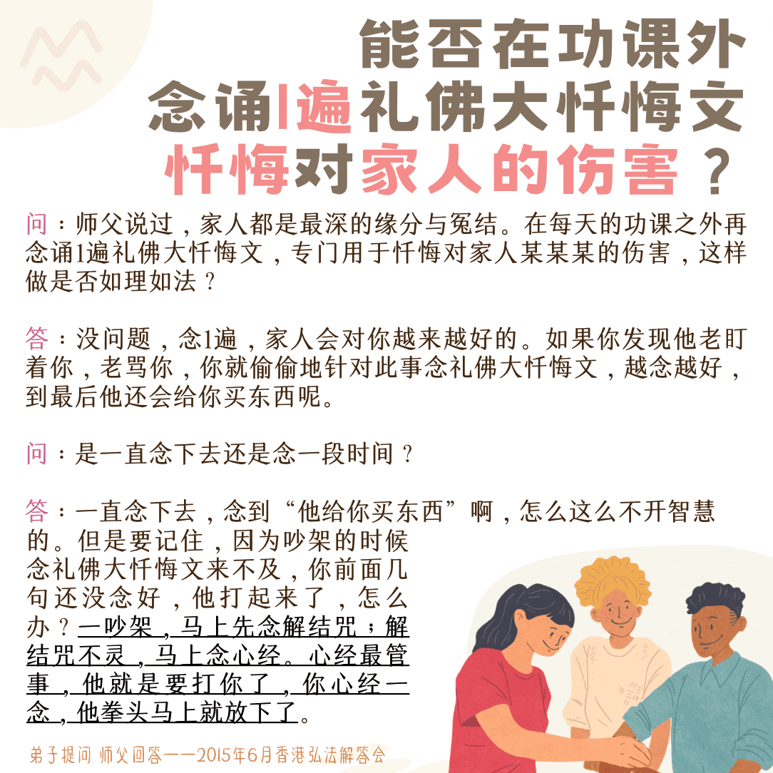 女听众:在念礼佛大忏悔文的时候,如果是针对忏悔感情方面的业障,然后在大日子或者初一、十五的时候礼佛大忏悔文念了多了一点,晚上就会梦到不同的缘分,有的是认识的人,有的是不认识的人。请问师父,这些梦境是代表忏悔得不够,还是说这些已经在梦里应掉了?答:忏悔得不够,没那么快应掉的。就是说在忏悔的时候,前世、这辈子应该未来会碰到的那些缘分都会先提早显现的