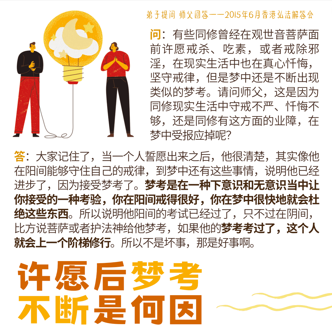 女听众:有一个同修他母亲患了癌症,之前三姐弟许过愿,会帮他母亲在多久时间内完成500张小房子。在之前那位同修也打过电话给师父,看过他母亲的图腾。现在其中的一个姐姐怀孕了,不能帮母亲助念,少了一个人助念,他们怕赶不及在许愿的时间完成,在这样的情况下,他们可以跟菩萨说再延迟时间吗?或者是向他人结缘自存的小房子,或者有其他方法吗?请师父开示一下,谢谢师父。台长答:首先,完不成就叫不能如愿,你跟菩萨讲可以的,但是你已经不如愿了,就这么简单。你说说看,你本来应该答应人家的事情你最后去跟人家说“不行,往后推”,你说人家会开心吗?你不叫撒谎啊?你实在做不成功的话,一边结缘点小房子吧(哦,就可以问人家结缘一点小房子先还掉?)以后再还给人家么就好了(好的,我知道)