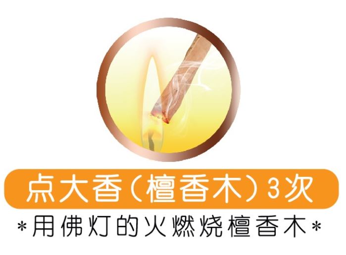 ● 燃大香,就是在佛坛前点好佛灯,点好香,然后用佛灯的火燃烧檀香木,然后把火熄灭(不能用嘴吹),出来的烟就是大香,是菩萨的香味。